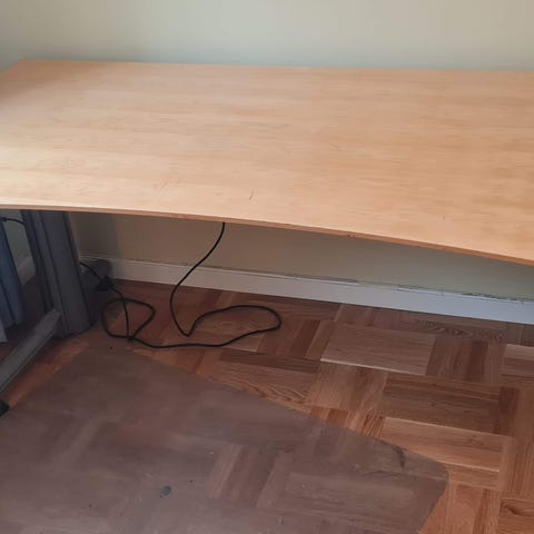 Säljer ett stort och stabilt skrivbord/arbetsbord med träskiva i snygg ek-look och kraftigt svart metallstativ. Modern industriell stil som passar perfekt i både hem och kontorsmiljö.