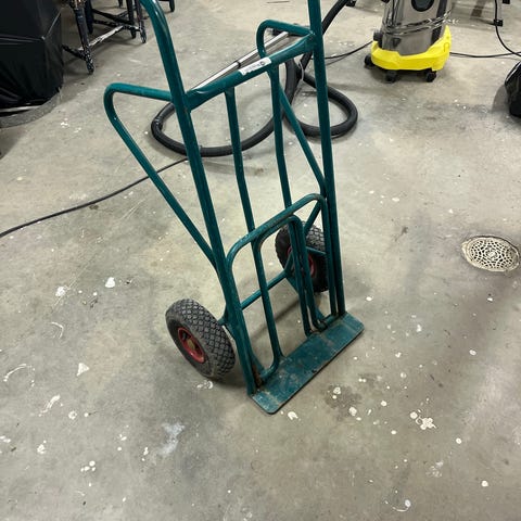 Säckkärra i röd metall med två hjul. Konstruktionen består av ett stående handtag med bygel och en nedre lastplatta för att kunna transportera lådor, kartonger eller annan gods. Hjul med gummibana. Passar för förflyttning av tyngre föremål i exempelvis förråd, garage eller vid flytt. Det som är på hjulen är torkade löv. Pris prutat och klart finns i v frölunda
