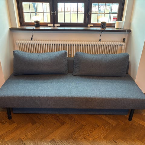 Mörkblå bäddsoffa i sammetstyg. Köpt för ca 6 år sedan men fortsatt i väldigt fint skick. Bädden fälls ut superlätt genom att lyfta underifrån, och extraben fälls ut automatiskt. Mycket bra kvalitet på sängen som är längsbäddad, se bilder. Klädsel är Trento navy blue, som har utgått hos Mio. Svårt att fånga den verkliga nyansen på bild, men bild 1 och 2 är mest rättvisa. De lånade bilderna visar inte rätt färg.