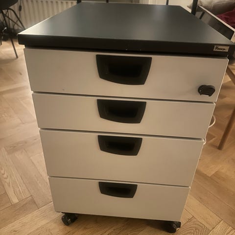 Förvaringsvagn med flera utdragbara lådor i plast. Vagnen har en svart ovansida med fack för mindre föremål och grå sidor. Utrustad med hjul för enkel förflyttning. Lämplig för förvaring av tillbehör, verktyg, kontorsmaterial eller liknande i exempelvis salong, verkstad eller hobbyrum.