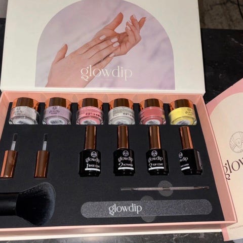 Glowdip nagelkit med flera färgade pulver, flaskor med vätskor för applicering samt tillhörande verktyg. Kitet innehåller flera små burkar med olika nyanser, flaskor med penselapplikator, nagelfil och pincett. Avsett för nagelvård och dekorering av naglar hemma.