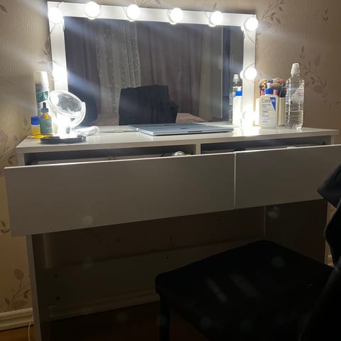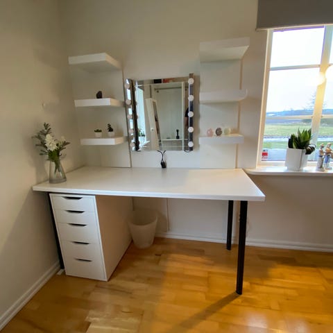 Säljer nu min praktiska skrivbordslösning från IKEA, perfekt som både arbetsplats eller sminkbord. Paketet innehåller skrivbord, en separat rullhurts och en skrivbordsstol.