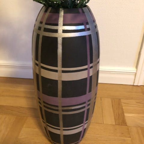 Cylinderformad vas i vit färg med svart ornamentmönster. Passar för snittblommor, torkade växter paraplyer käppar eller som dekorativ inredningsdetalj. Placeras exempelvis på golv, bord eller byrå. Materialet är keramik.
