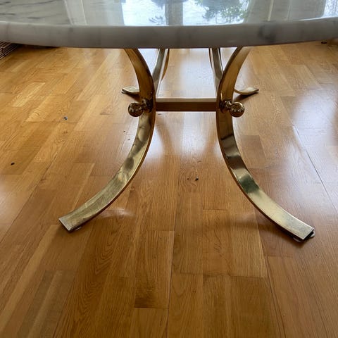 Fint soffbord med äkta marmorskiva. Finns 2 mindre ”skador” som inte är märkbara när det står på plats vid en soffa. För mått se bilder. Sista bilden är från butiken där det är köpt även om detta är något mindre. Finns i centrala Norrtälje. Skivan ligger lös på bordet så lätt att frakta och montera.