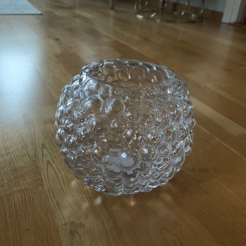 Vas av tjockt glas, asymmetrisk. Perfekt för buketter. Vasen är dekorerad med hjärtan utanpå.