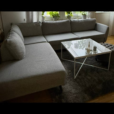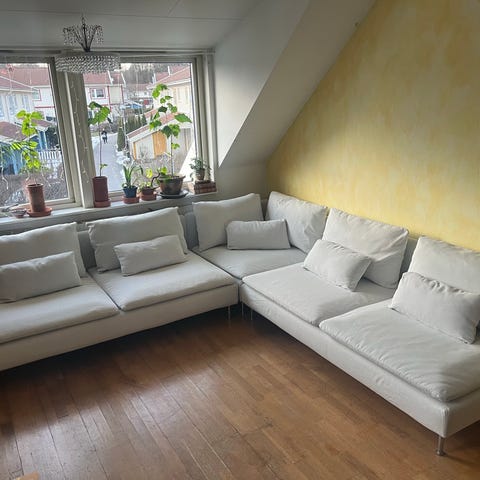 Säljer våran soffa från IKEA modell: Söderhamn. Tyget är tallmyra vit/svart men soffan är grå. 4-sitssoffa med schäslong.