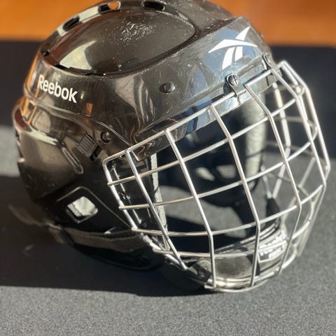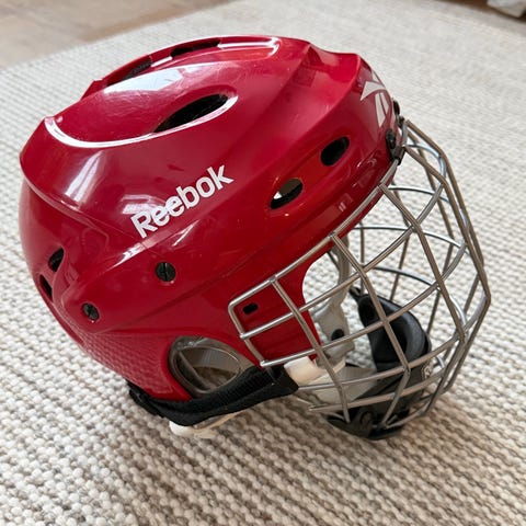 Reebok 3K ishockeyhjälm med galler i röd färg, storlek M. Hjälmen har justerbara remmar under hakan och ventilationsöppningar upptill för luftcirkulation. Utrustad med metallgaller framtill för ansiktsskydd vid ishockeyspel eller annan isträning där huvud- och ansiktsskydd krävs.