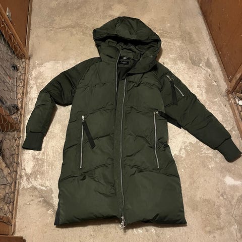 Everest lång jacka för dam i storlek 40. Jackan är grön och tillverkad i polyester med vadderad, dunliknande känsla. Modellen är lång med hög krage och fast huva. Framtill finns dragkedja samt två stora fickor med lock och tryckknappar. Jackan har även dragkedja nertill framtill för ökad rörelsefrihet. Passar som ytterplagg vid kallare väder. Aningen kärv i dragkedjan.