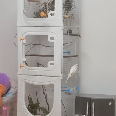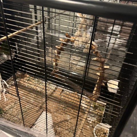 Helt ny bur med tak för smådjur i svart metall och plast. Burens design inkluderar ett takliknande skydd och hjul för enkel förflyttning. Innehåller tillbehör som vattenflaskor, sittpinnar och leksaker. Passar för smådjur och fåglar. Dessutom följer en burtransport med.