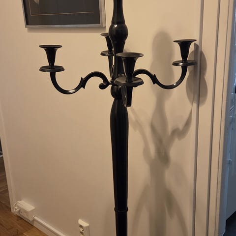 Golvljusstake i form av en kandelaber i silverfärgad metall. Ljusstaken har flera armar för kronljus och står på golvet med en hög, slank fot. Passar som belysningsdetalj i vardagsrum, matsal eller hall och kan användas vid exempelvis middagar eller andra tillfällen där man vill ha levande ljus. 150 cm i längd.