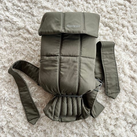 BabyBjörn bärsele i grått tyg. Bärselen har justerbara axelremmar och midjeband med spännen för att kunna anpassas efter bäraren. Passar för att bära barn nära kroppen med stöd för rygg och höfter. Materialet är mjukt textilmaterial med synliga sömmar framtill och korsade remmar på ryggen för stabilitet.