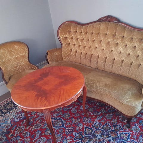 Soffa tvåsits guldfärgad med trädetaljer