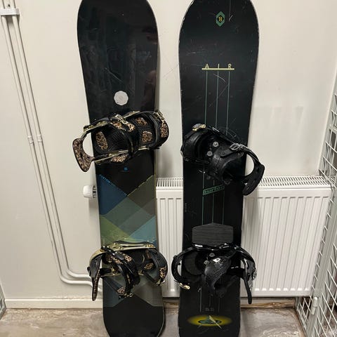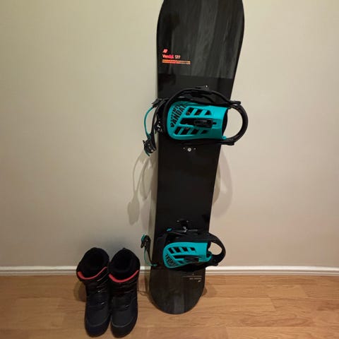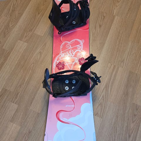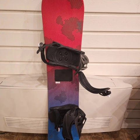Snowboardpaket bestående av snowboard (137 cm) med bindningar samt snowboardboots. Snowboarden har blått och svart mönster med svarta bindningar med röda detaljer. Snowboardbootsen är storlek 39, svart/bruna med snörning och högt skaft för stöd runt fot och ankel.