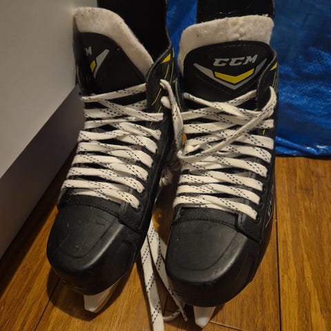 CCM ishockeyskridskor för barn i EU-storlek 33. Skridskorna har svart och gul ovandel med vita snören och vit innersida. Bladen är monterade i vit hållare. Modellen är avsedd för ishockey och passar barn med skostorlek 33 som behöver stabila skridskor för träning eller spel på is.