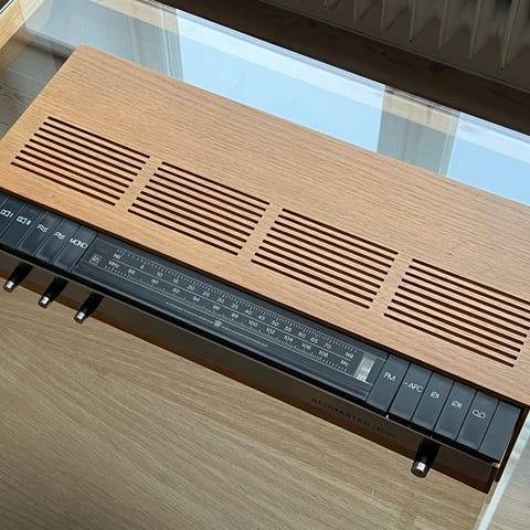 Vi har nu tagit ner vår trotjänare Bang & Olufsen. Den består av radio, CD-del, och tape. Den har två högtalare och tillhörande fjärrkontroll. Glasdörrarna något kärva. Fjärrkontrollen har knappar för volym, källval och navigering. Har även fungerat som komplett ljudsystem för hemmet med möjlighet att koppla in externa ljudkällor.