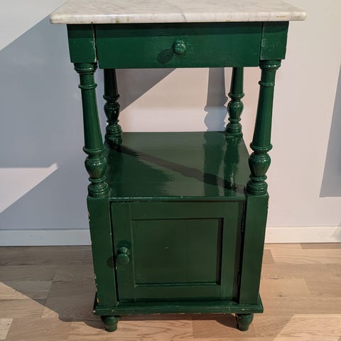 Ovalt sidobord i trä, målat i beige. Bordet har en skiva med mjukt rundade kortsidor och små utskjutande partier längs långsidorna. Underredet består av svarvade ben och dekorativ mittstag, med fyra svängda fötter som ger stabilitet. Passar som soffbord, lampbord eller avlastningsbord i vardagsrum, hall eller sovrum. H= 76 cm, B= 98 cm, D= 54 cm. Kan hämtas i Särö strax söder om Göteborg.