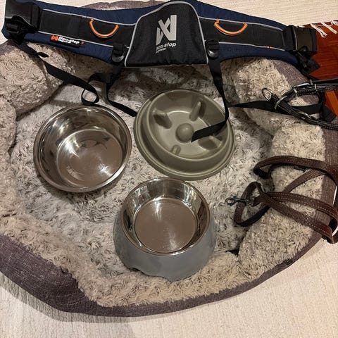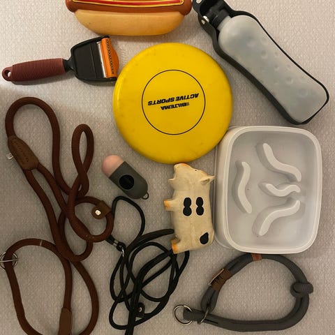 Paket med hundtillbehör. Innehåller flera matskålar och vattenskålar i plast, olika leksaker som bollar och tuggleksaker med rep, bajspåsehållare, samt hundtäcke eller filt med benmönster och en grå mjuk pläd. Flera koppel i olika längder, flexikoppel, halsband och selar i olika storlekar. Två runda hundbäddar i grått tyg med vadderad insida. Passar för hundägare som behöver ett grundpaket med utrustning till en eller flera hundar, både för inomhusbruk och promenader utomhus.