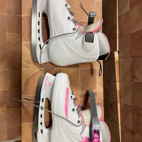 Li’l Angel skridskor för barn i vit och rosa färg. Modellen har hårt ytterskal i plast med justerbart spänne över foten för att hålla skridskon på plats. Insidan är vadderad för ökad komfort och stöd runt fot och ankel. Skridskorna har metallskena anpassad för åkning på is, lämpliga för nybörjare och lek på isbanor eller sjöis under säkra förhållanden.
