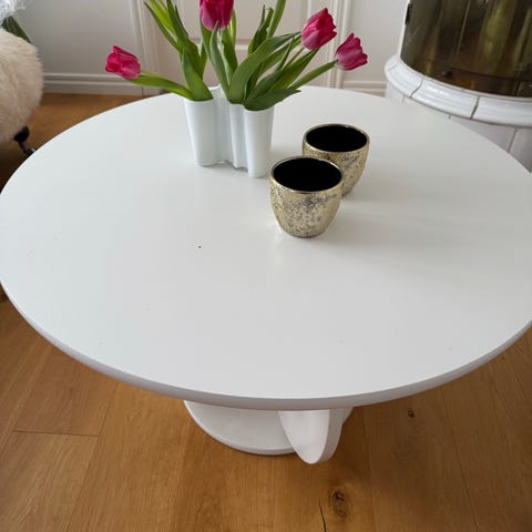 Runt bord i trä, målat i vitt. Bordet har fyra raka ben och en slät, rund bordsskiva. Passar som soffbord, avlastningsbord eller sängbord i vardagsrum, sovrum eller hall. Finns i Särö strax söder om Göteborg.
