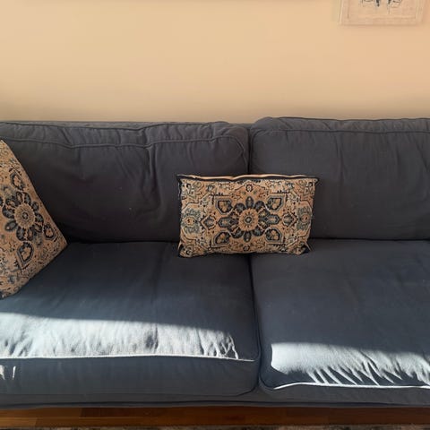 OBS: fötterna är inte original (tror vi) så dom kan behöva bytas, därav priset. Benet i mitten på bakre delen lutar mycket så soffan bör stå mot en vägg för att inte ”gunga”. Men byter man ben så funkar det nog bättre!