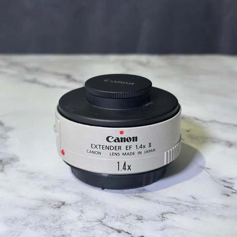 Canon Extender EF 1.4x II telekonverter i vit färg. Avsedd för Canon EF-objektiv och ökar brännvidden 1,4x.