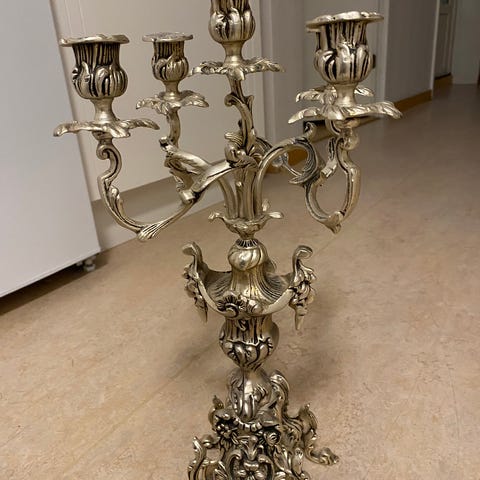 Ljusstakar, tunga och vackra kandelabrar i tvåfärgad metall. 40 cm höga. Förhöj middagsbordets glans.