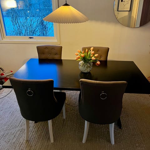 Träbord och 4 stolar. OBS! Stolsdynorna till alla 4 stolarna är sönderrivna av katter. Hämtas i Sundbyberg.