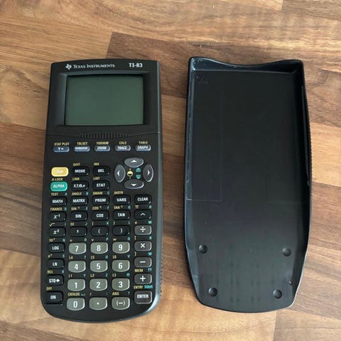 Texas Instruments TI-83 Plus grafräknare i svart utförande. Modellen har ett numeriskt tangentbord med funktions- och piltangenter anpassade för grafräkning, statistik och algebraiska beräkningar. Skärmen visar flera rader text och siffror samtidigt. Batterifack på baksidan och avtagbart skyddsskal ingår, som kan skjutas över framsidan vid förvaring och transport. Passar till exempel för matematik- och naturvetenskapskurser där grafräknare krävs.