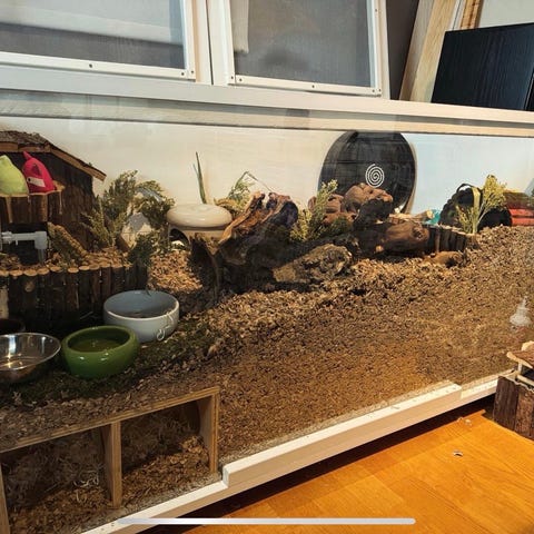 Hamsterbur till salu. Buren är ett vitrinskåp med egen byggda lock. Du får med, hjul, hus, broar, mat- och vattenskål, samt annan burinredning som är anpassat till dvärghamster. Allt av material förutom hjul är i trä, keramik, glas, terrakotta. Du får även med damfritt spån, alspån, mossa, sand o mat/godis. Måtten är 160x45x40. Buren är endast lämplig för dvärghamster eftersom det inte går o skapa tillräckligt med grävdjup som en guldhamster behöver. Har du några andra frågor så är det bara att höra av sig, mvhTilda.