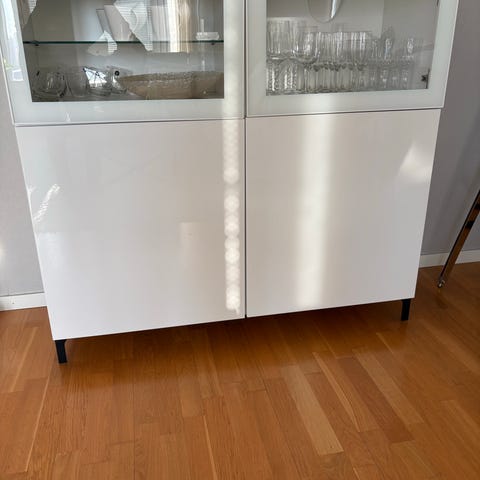 IKEA vitrinskåp i vitt med glasdörrar upptill och förvaringsdel nedtill. Övre delen har glashyllor som lämpar sig för förvaring av glas, porslin eller dekorationer. Nedre delen består av stängd förvaring för exempelvis köksprylar eller andra saker som inte behöver stå framme. Passar i vardagsrum, matsal eller kök som kombinerad förvaring och display. Behövs skruvas till så att den blir jämn i alla kanter.