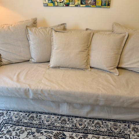 Förvaringsutrymme under sitsen. Kuddarna medföljer. Ett litet märke på soffan som man säkert kan ta bort.