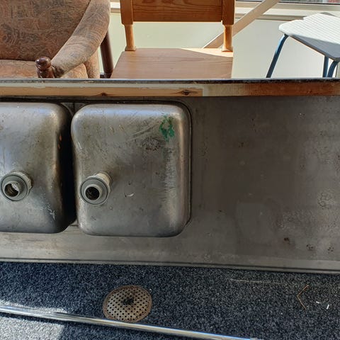 Köksluckor, kylskåp samt diskho med bänk