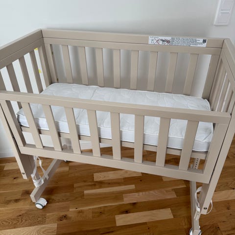 Madrass, spjälsängsskydd och sängmobil ingår.