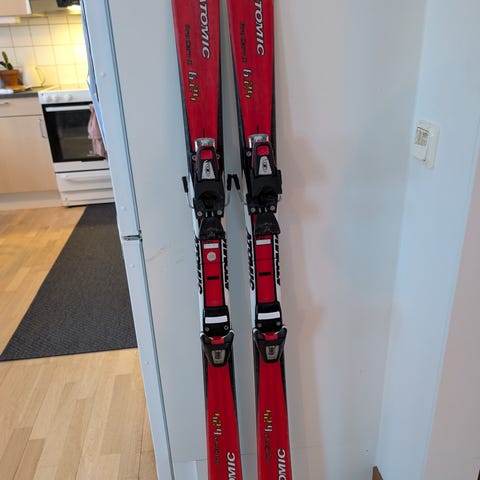 Ett par röda Atomic Redster J4 140 cm alpinskidor med bindningar. Bra racerskidor för barn på preparerat underlag. Ovansidan är kosmetiskt sliten med bortskavd färg på sina håll (se bilder).