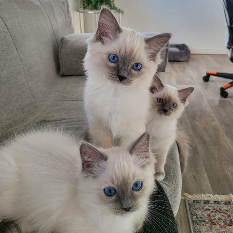 De är en mix av Ragdoll/Maine Coon, och både mamman och pappan är också Ragdoll/Maine Coon – vilket ger kattungarna ett fantastiskt temperament, mycket fluff och stora, fina drag.