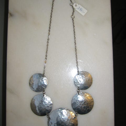 Silver färgade stora ringar emellan avslutas med svart kedja baktill