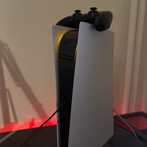 Sony Playstation 5 spelkonsol i vit färg. Konsolen är avsedd för spel, film och streaming och kan anslutas till tv eller bildskärm via HDMI. I bilderna syns även två DualSense-handkontroller i vit färg som är kompatibla med Playstation 5. Systemet stödjer digital nedladdning av spel samt uppspelning av kompatibla fysiska spel. 2x controller. allt ingår i lådan.