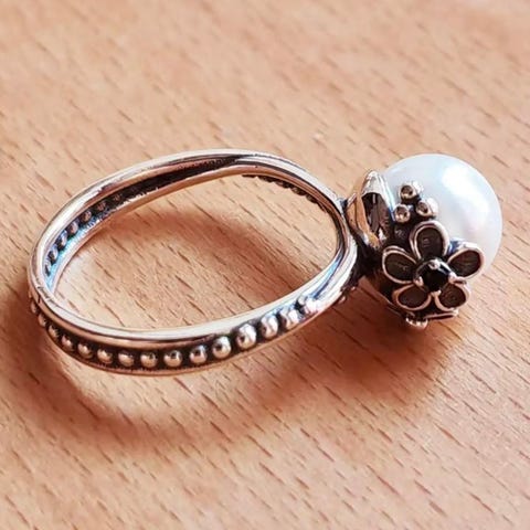 Pandora ring i silver (stämplad S925 ALE) med infattade kristaller över ovansidan och sidorna. Ringen har en fyrkantig mittdel med omgivande mindre kristaller som ger ett markerat mönster. Passar som smycke till vardag eller fest.