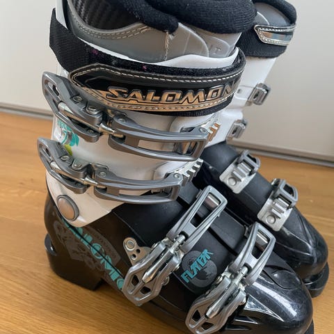 Salomon Symbio 4.0 pjäxor i storlek 24.0. Modellen har hårt ytterskal i svart plast med flera justerbara spännen framtill för att kunna anpassa passformen över fot och underben. Invändigt finns en vadderad innersko i kontrastfärg för komfort och stöd. Sulorna är mönstrade för bättre grepp vid gång. Lämpliga som alpina pjäxor för skidåkning i pistsystem med standard skibindningar. Lätta att ta på och av genom fiffig funktion (se bild 4)