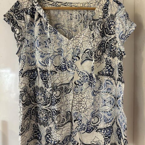 H&M linne för dam i storlek 38. Ärmlös topp med flerfärgat mönster i svart/marinblå och vitt. Rundad halsringning med liten V-öppning framtill.