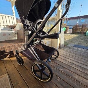 Blockets AI-text: Cybex sulky i blått tyg med lätt aluminiumchassi. Vagnen är hopfällbar och har fyra hjul med svängbara framhjul. Sittdelen är justerbar med flera lutningslägen och har sufflett för sol- och vindskydd. Utrustad med bygel framtill och varukorg under sittdelen för förvaring vid användning i vardagen och på resor.