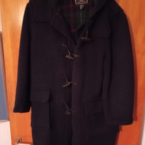 Klassisk duffeljacka med huva, knäppning med öglor och träknektar samt två fickor fram. Jackan är tillverkad i England.