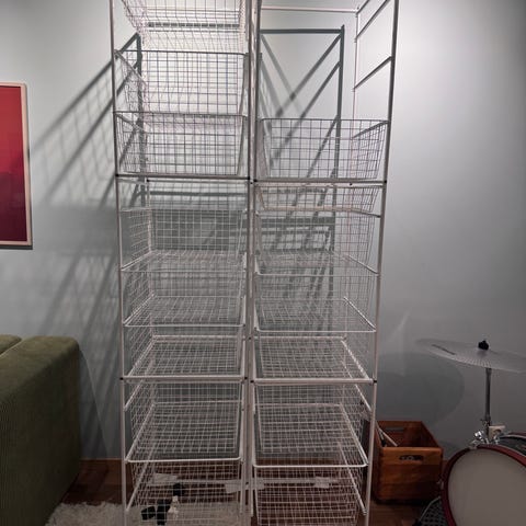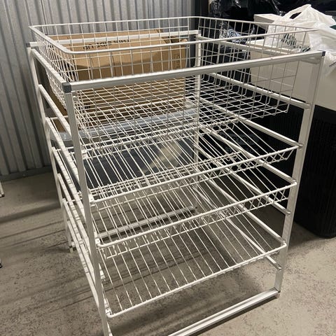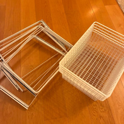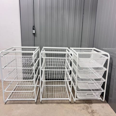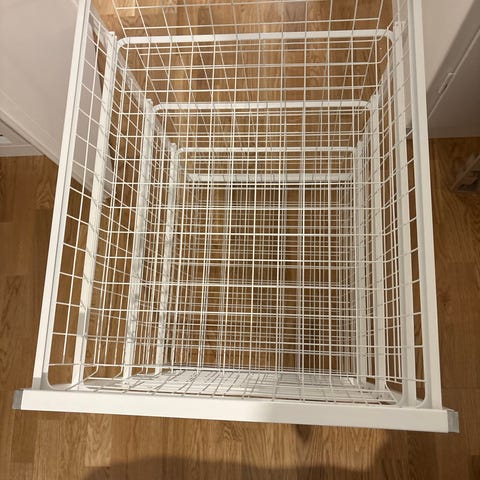 Säljer tre stycken stabila trådbackar i vit metall, perfekta för garderob, walk-in closet, tvättstuga eller förråd. Mycket bra skick, hela och rena.