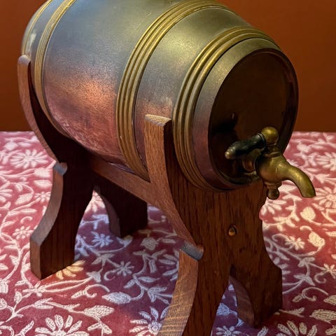 Öl/whiskytunna,trä med järnband,ca10liter,42cm lång,ca95cm runt”magen”.