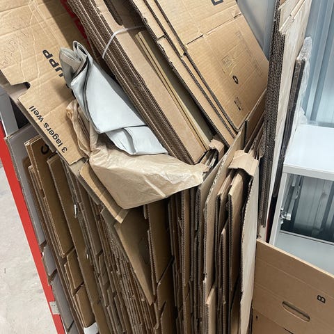 Kartonger i stor mängd, lämpliga för förvaring och flytt.