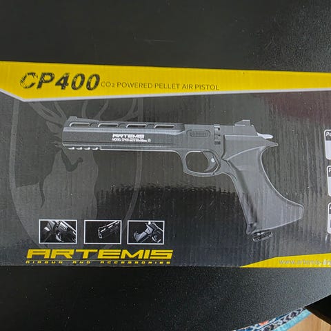 Utrustning för soft air gun, inkluderar pistol, glasögon och extra ammunition.