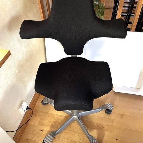 Märke: Håg Capisco 8106, flexibel kontorsstol med sadelsits för dig som vill sitta aktivt och stärka upp bål och rygg – för bättre hållning och minskad risk för värk. Flexibel på både höjd och djup, svart. Nypris ca: 14 000 kr.