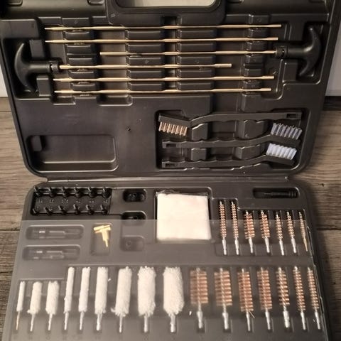 Rengöringssats för jaktvapen i originalförpackning. Satsen innehåller flera olika rengöringsverktyg, bland annat borste och stänger, anpassade för vapenvård. Levereras i originalask med tryckt motiv och text "Rengöringssats för jaktvapen" på locket. Lämplig för rengöring och underhåll av gevär och andra jaktvapen.