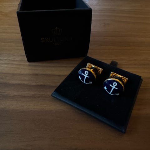 Skultuna Three manschettknappar för man i blått och guld. Runda knappar med blå emaljliknande framsida och guldfärgad metall. Levereras i originalask från Skultuna enligt bilderna. Passar till skjortor med dubbla manschetter och kan användas vid både formella och mer vardagliga tillfällen.