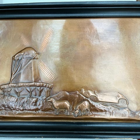 Tegner tavla föreställande ett textilskåp med miniatyrtextilier. Motivet visar ett skåp med hyllor dekorerade med spetskant, där vikta tyger, dukar och små accessoarer i olika färger är placerade. Tavlan är inramad och försedd med glas framtill. På baksidan finns etikett med texten "Tegner" samt upphängningsbeslag. Passar som väggdekoration i exempelvis kök, hall eller vardagsrum.
